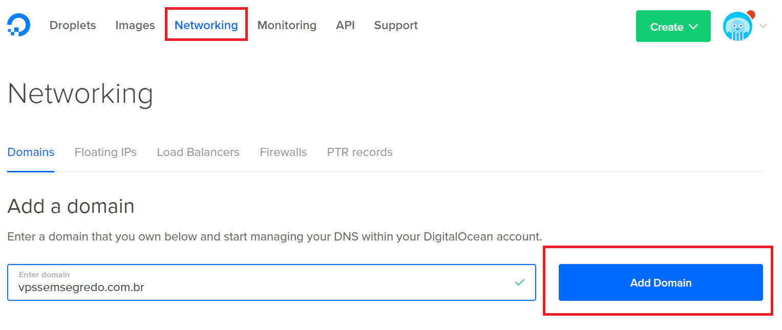 1.1 – Acesse seu painel da Digital Ocean, clique em Networking, em Add a domain, adicione seu domínio e por fim, clique em “Add Domain”.
