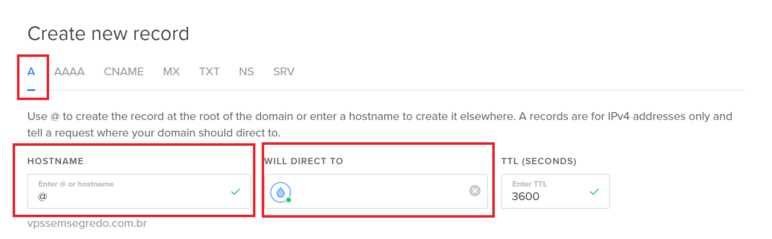 1.2 – Na seção que abrir para criar um novo registro, selecione “A”, no campo HOSTNAME, preencha com @ e no campo “Will Direct TO”, selecione a VPS criada, finalize clicando em “Create Record”.