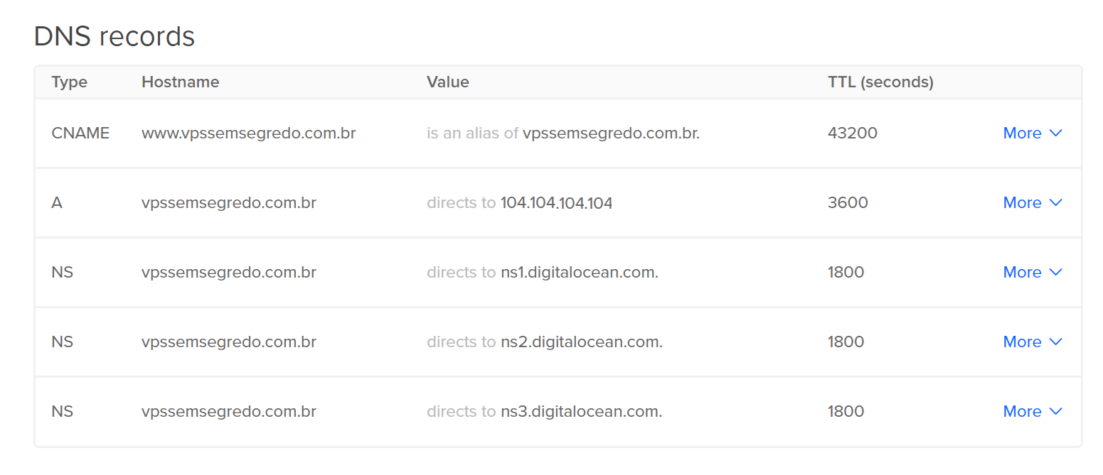 Sua tabela de registro de DNS ficara semelhante a tabela abaixo: