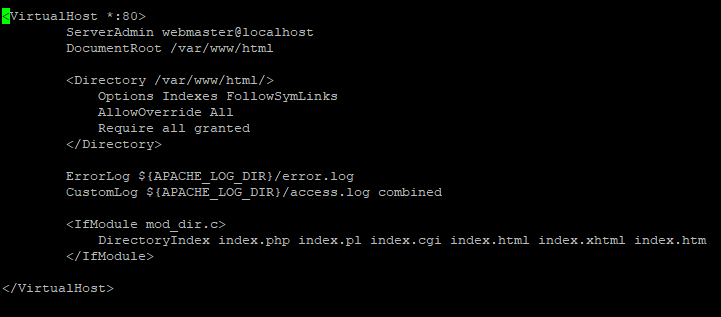 <VirtualHost *:80> ServerAdmin admin@seusite.com.br ServerName seusite.com.br ServerAlias www.seusite.com.br DocumentRoot /var/www/seusite.com.br <Directory /var/www/seusite.com.br/> Options Indexes FollowSymLinks AllowOverride All Require all granted </Directory> ErrorLog ${APACHE_LOG_DIR}/error.log CustomLog ${APACHE_LOG_DIR}/access.log combined <IfModule mod_dir.c> DirectoryIndex index.php index.pl index.cgi index.html index.xhtml index.htm </IfModule> </VirtualHost>